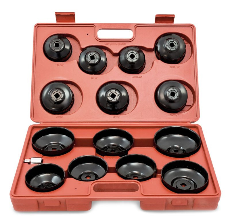 Sada 14 kusů nejrozšířenějších rozměrů miskovitých klíčů (hlavic) na olejové filtry. Součástí sady je adaptér čtyřhran 3/8" na 1/2". Klíče odolají momentu až 115 Nm. Klíče mají povrchovou úpravu proti korozi. Vše přehledně uspořádáno v platovém kufru.