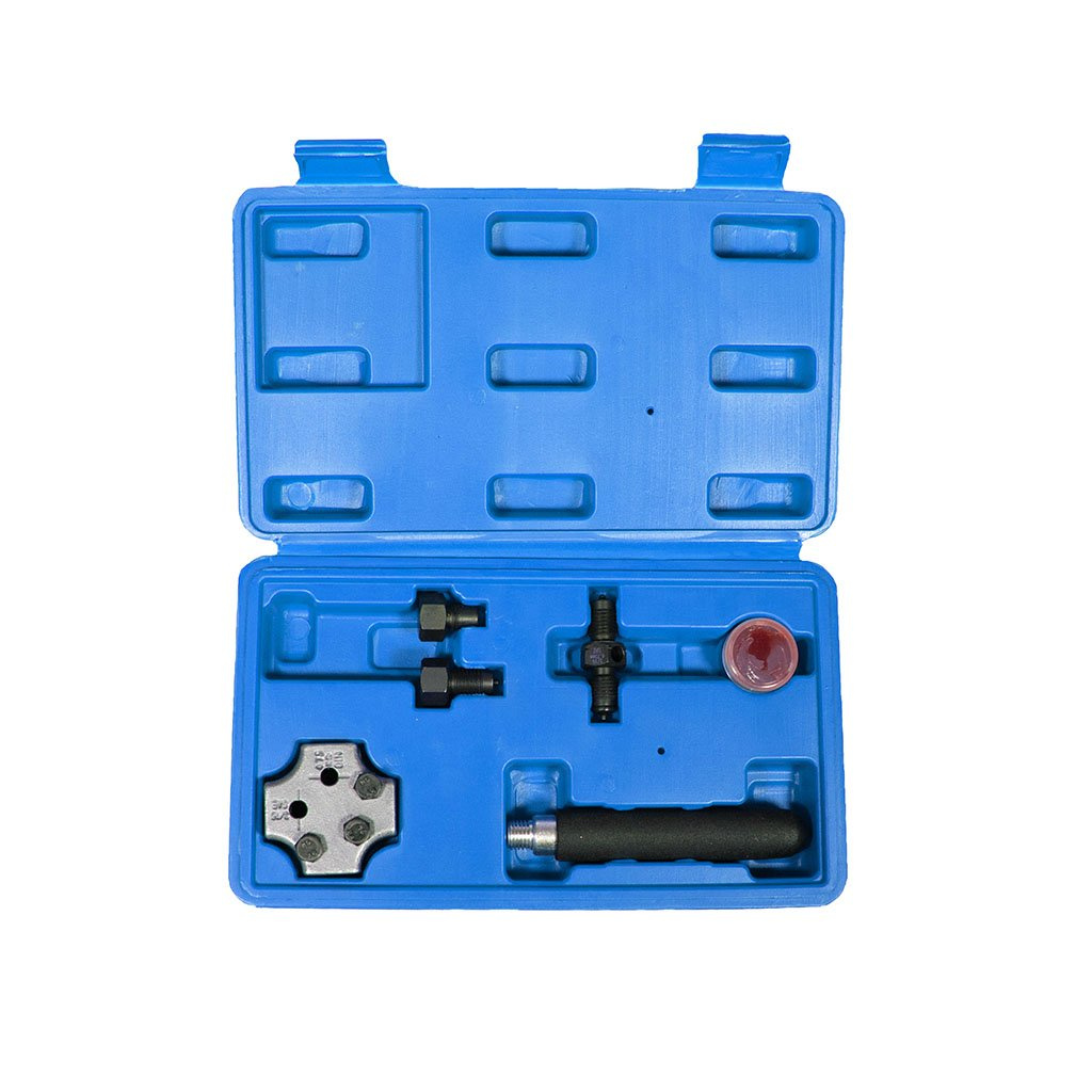 Pertlovací sada pro úpravu konců brzdových trubiček Ø 4,75 mm vylisováním připojovacího lemu podle norem DIN a SAE.