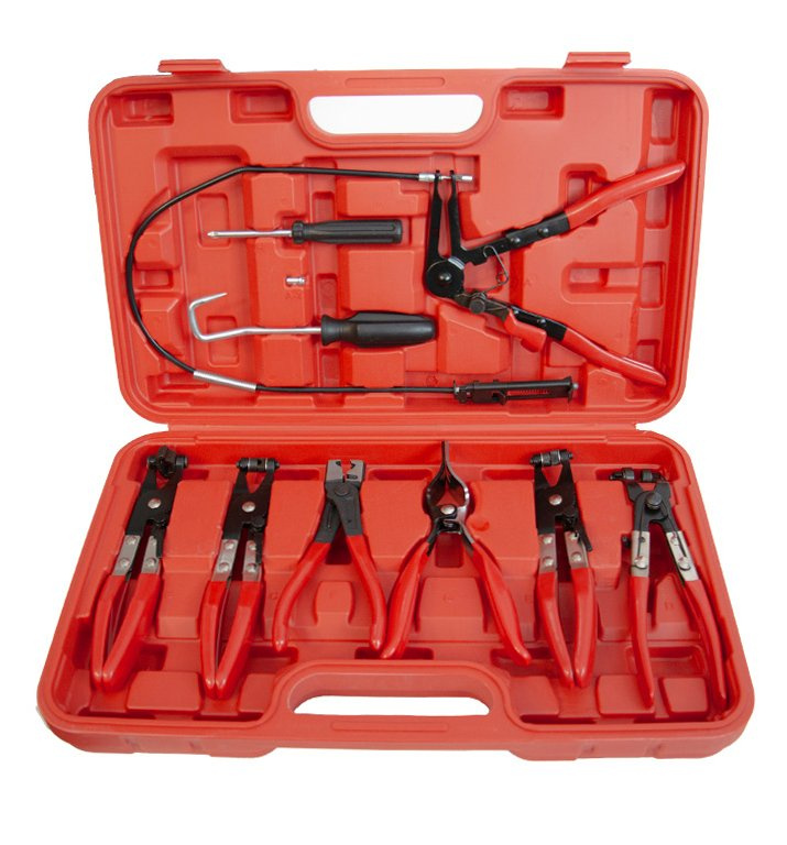 9-dílná sada kleští na hadicové spony s přípravkem na demontáž hadic a šroubovákem na hadicové spony. Více informací
